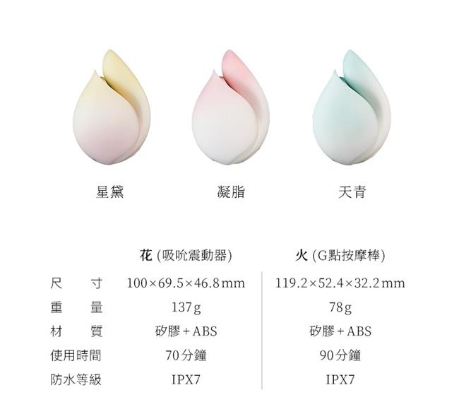 • 創新分離設計:吸吮震動器+G點按摩棒